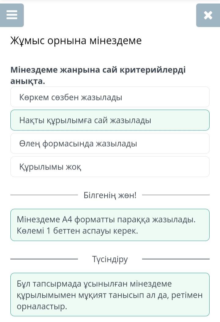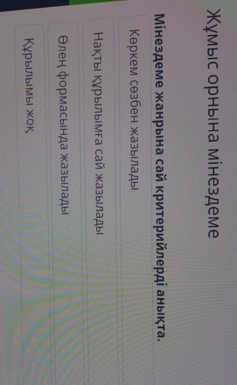 Жұмыс орнына мінездеме Мінездеме жанрына сай критерийлерді анықта. Көркем сөзбен жазылады Нақты құрылымға сай жазылады Өлең формасында жазылады Құрылымы жоқ