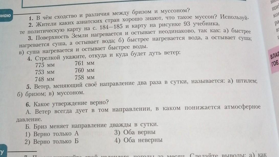 1.Муссон так же как и бриз постоянно дует между сушей и морем. Однако муссонные ветры меняют свое направление в течении года, в зависимости от времени года. Бриз меняет свое направление в течении суток.