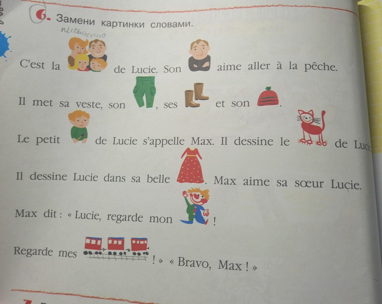 C'est la *famille* de Lucie.Son *pere* aime a la peche.Il met sa veste,son *pantalon*,ses *bottes* et son *chapeau*.Le petit *frère* Lucie s'appelle Max.Il desine le *chat* de Lucie.Il desine Lucie dans sa belle *robe*.Max aime sa soeur Lucie.Max dit:Lucie ,regarde mon *clown*!Regarde mes *train*!Bravo,Max!