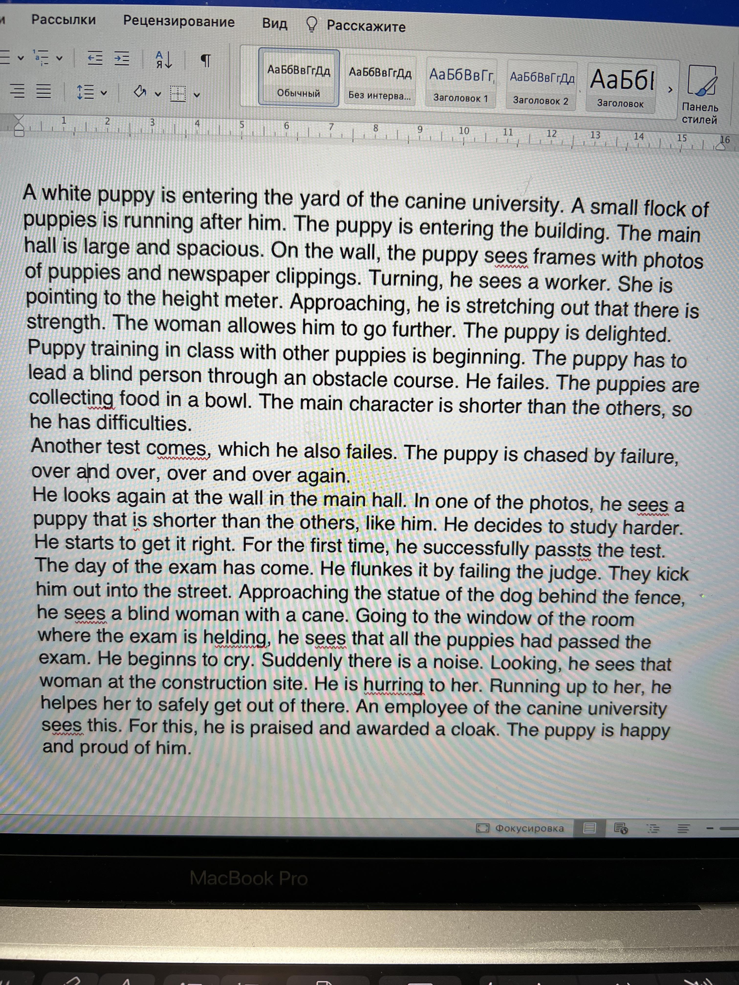 The day of the exam has come. He flunked it by failing the judge. They kicked him out into the street. Approaching the statue of the dog behind the fence, he saw a blind woman with a cane. Going to the window of the room where the exam was being held, he saw that all the puppies had passed the exam. He began to cry. Suddenly there was a noise. Looking, he saw that woman at the construction site. He hurried to her. Running up to her, he helped her to safely get out of there. An employee of the canine university saw this. For this, he was praised and awarded a cloak. The puppy was happy and proud of him.