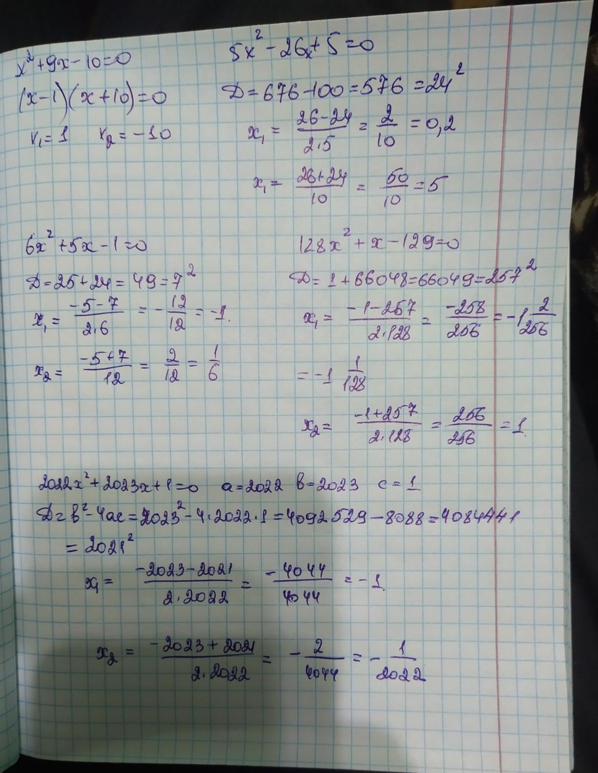 СРОЧНО Решить уравнения: 1) x^2+9x-10=0; 2) 5x^2-26x+5=0; 3) 6x^2+5x-1=0; 4) 128x^2+x-129=0; 5) 2022x^2+2023x+1=0