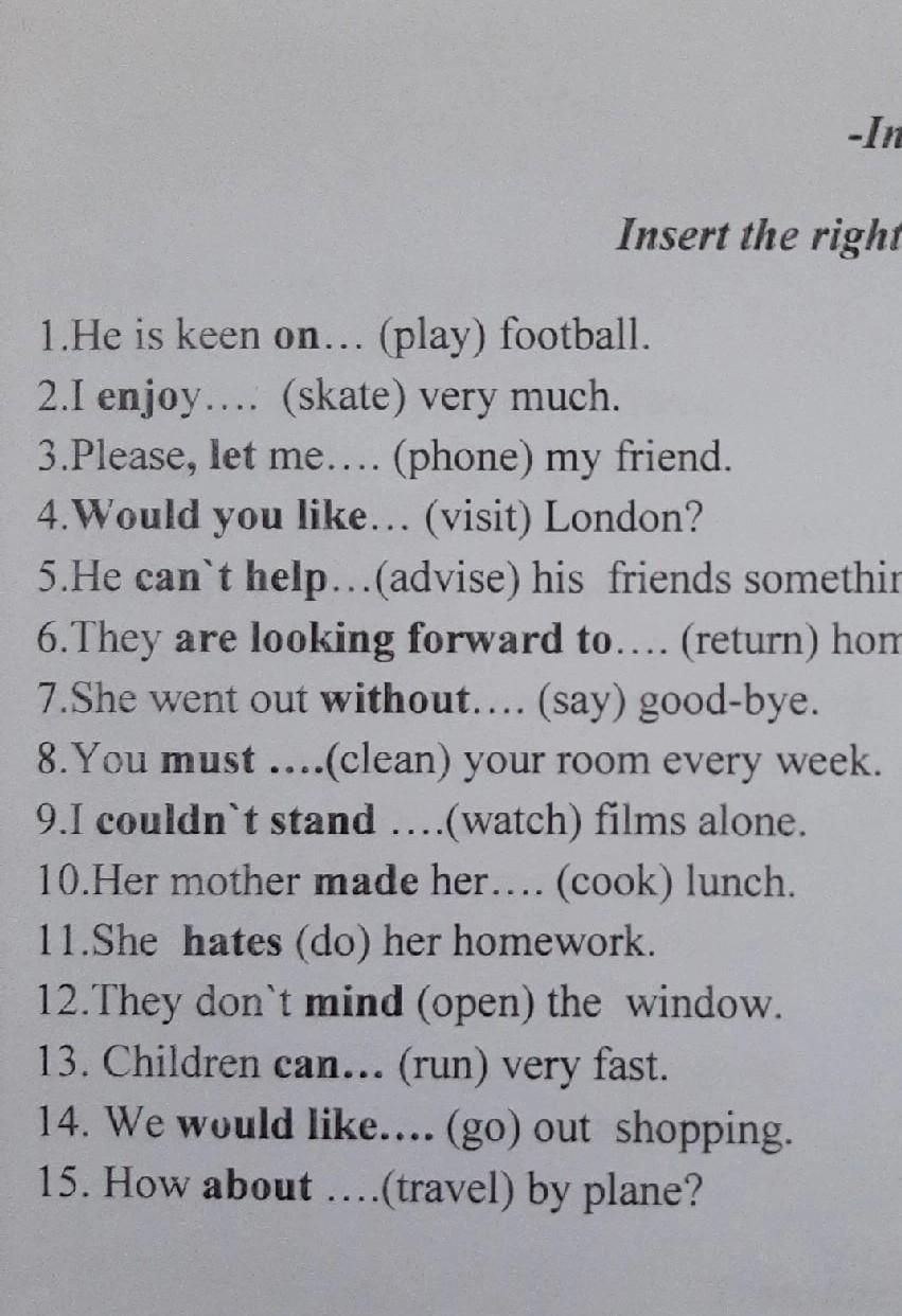 1playing 2skating 3 phone 4 to visit 5 advising 6 returning 7 saying 8 clean 9 watching 10 cook 11 doing 12 opening 13 run 14 to go