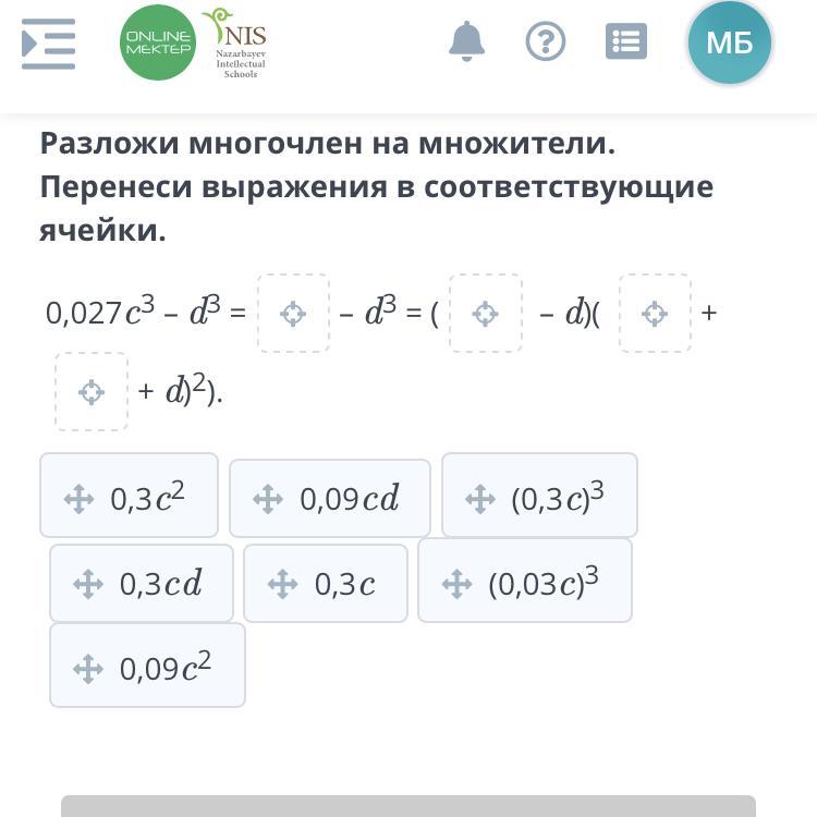 0,027C³-d³=(0,3c)³-d³=(0,3c-d)(0,09c²+0,3cd+d²)