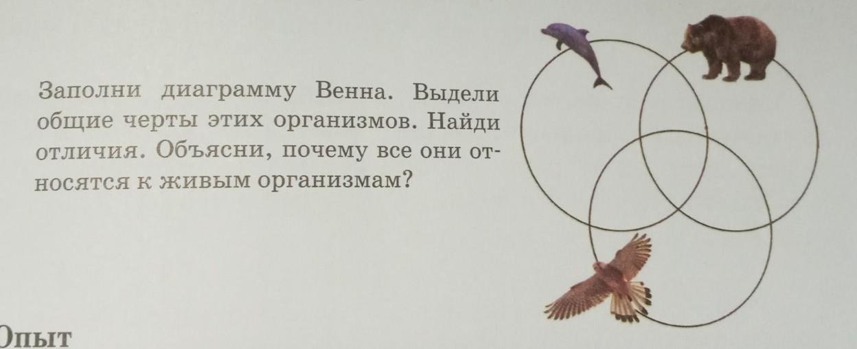 Заполни диаграмму Венна. Выдели общие черты этих организмов. Найди отличия. Объясни, почему все они относятся к живым организмам?