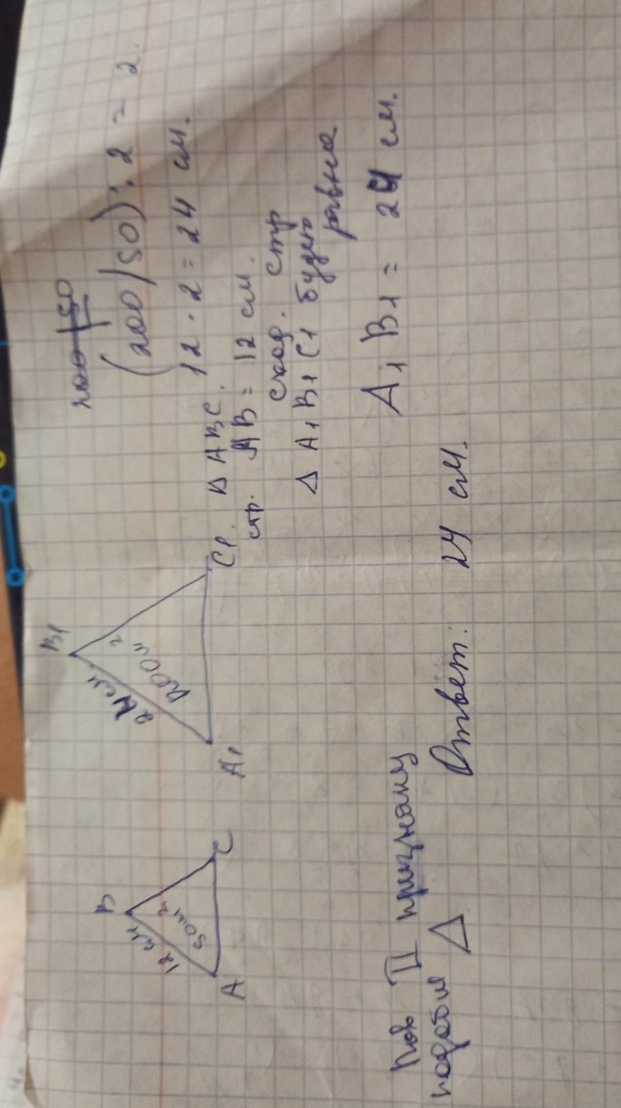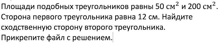 площади подобных треугольников равны 50см2 и 200см2 сторона первого треугольника равна 12 см найдите сходственную сторону второго треугольника