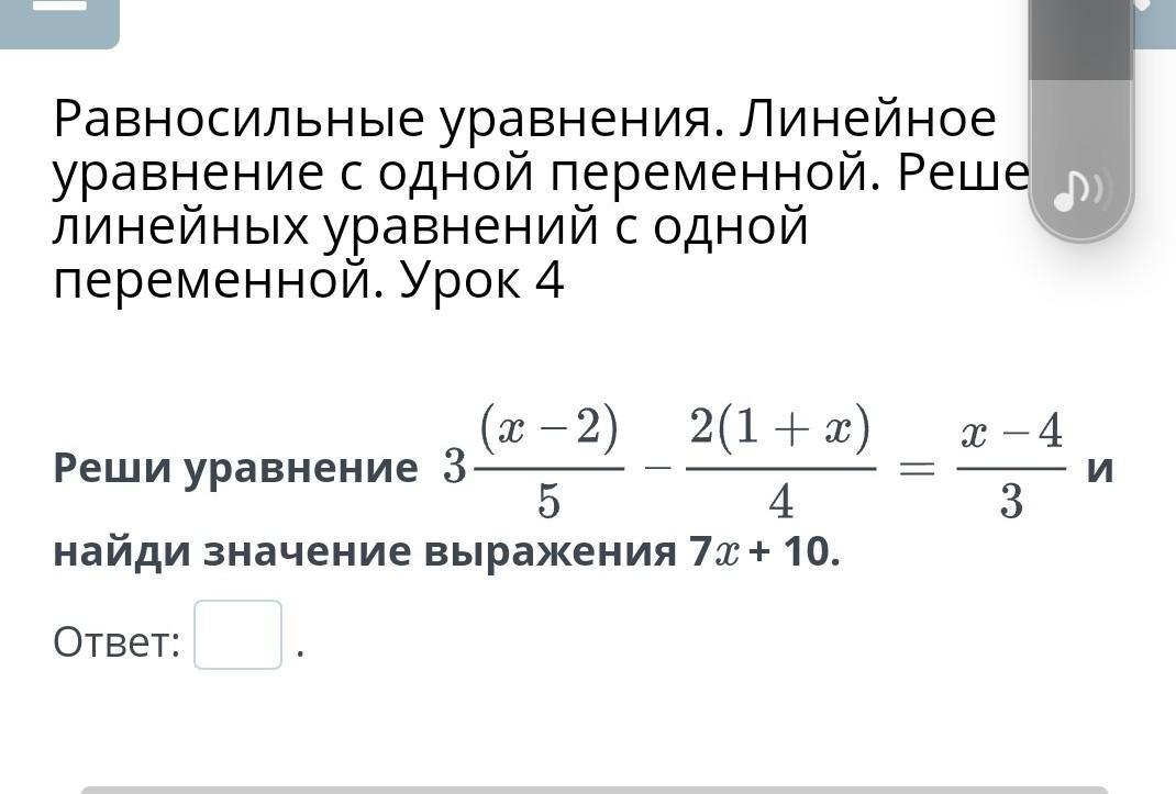 Равносильные уравнения. Линейное уравнение с одной переменной. Решение линейных уравнений с одной переменной. Урок 4 Реши уравнение и найди значение выражения 7x + 10.