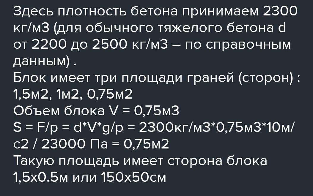 Какая сторона бетонного блока с размерами 50х150х100 опирается на землю, если блок создаёт давление 23 ? Плотность бетона 2,3 r /см(кубический)