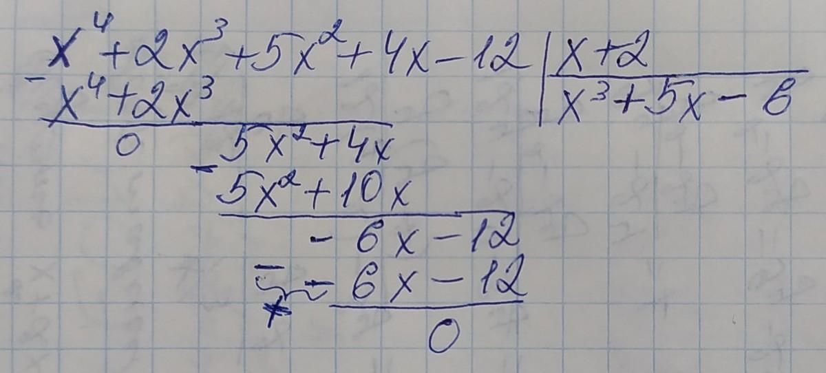 х³×2+х³×х=2х³+х⁴. Записываем полученное выражение х⁴+2х³ под частью делимого х⁴+2х³ и вычитаем одно из другого. В результате получаем 0. Сносим следующие члены выражения: 5х²+4х, также делим 5х²÷х=5х. Ставим в поле частного знак +, так как в выражении стоит знак + и записываем 5х, точно так же умножаем его почленно, после чего получим выражение 5х²+10х, которое записываем под выражением 5х²+4х. Вычитаем одно из другого и так как второе выражение больше первого, то оно вычитается со знаком минус, получим выражение –6х–12. Делим 6х÷х=6, записываем знак минус, (так как в выражении перед 12 стоит знак минус) и 6 (–6) в поле частного, перемножаем и получаем –6х–12. Записываем его под нашим результатом, и вычитаем. Обращаю внимание на последнее вычитание: так как оба выражения отрицательные, то получим результат: