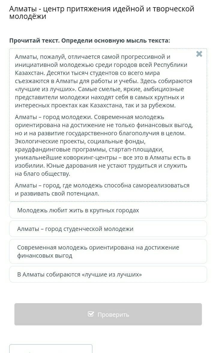 Алматы - центр притяжения идейной и творческой молодёжи Прочитай текст. Определи основную мысль текста:
