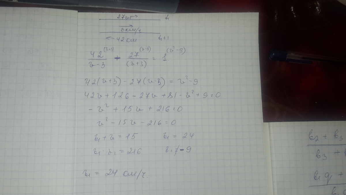 катер прошел 27 км по течению реки и 42 против течения,затратив на путь по течению на 1 час меньше ,чем против течения.Какова скорость катера против течения,если скорость течения 3 км/ч