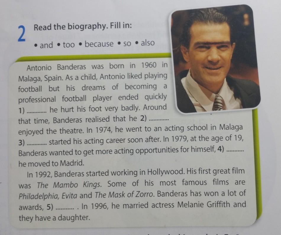 Read the biography. Fill in: 2 • and · too. because so • also Antonio Banderas was born in 1960 in Malaga, Spain. As a child, Antonio liked playing football but his dreams of becoming a professional football player ended quickly 1) ........... he hurt his foot very badly. Around that time, Banderas realised that he 2) ............. enjoyed the theatre. In 1974, he went to an acting school in Malaga 3) ........... started his acting career soon after. In 1979, at the age of 19, Banderas wanted to get more acting opportunities for himself, 4) ..... he moved to Madrid. In 1992, Banderas started working in Hollywood. His first great film was The Mambo Kings. Some of his most famous films are Philadelphia, Evita and The Mask of Zorro. Banderas has won a lot of awards, 5) ............ In 1996, he married actress Melanie Griffith and they have a daughter. 1 C