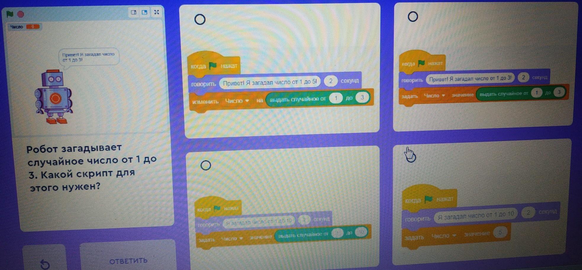в нем во первых правильно написано то что он загадал именно число от 1 до 3, а во вторых сама команда также правильно написана