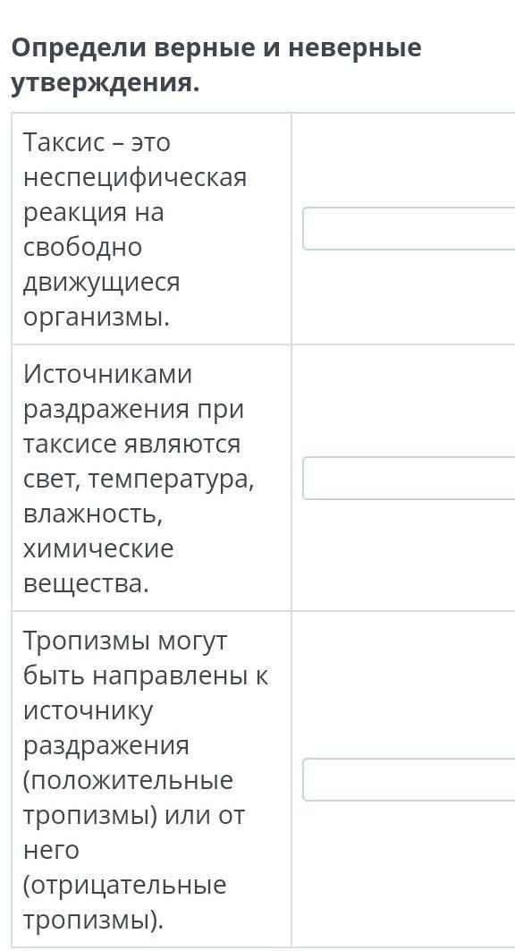 Движение растений. Значение движения для жизнедеятельности растений. Способы движения растений (тропизмы, таксисы, ростовые движения) Определи верные и неверные утверждения. Таксис – это неспецифическая реакция на свободно движущиеся организмы. Источниками раздражения при таксисе являются свет, температура, влажность, химические вещества. Тропизмы могут быть направлены к источнику раздражения (положительные тропизмы) или от него (отрицательные тропизмы). Назад Проверить