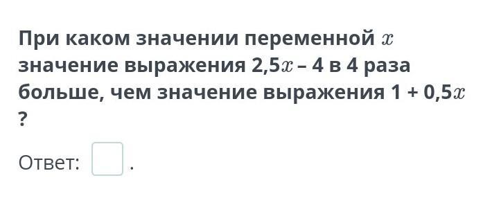при каком значении переменной x значение выражение 2,5х-4 в 4 больше чем значени выражение 1 + 0 , 5 х ?