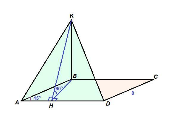 У ромбі ABCD AB = 8 см, ∠BAD = 45°. З вершини B до площини ромба проведено перпендикуляр BK. Площина AKD утворює з площиною ромба кут 60°. Знайдіть: