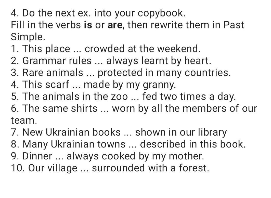 переклад: Введіть дієслова is або are, а потім перепишіть їх у Past Simple.