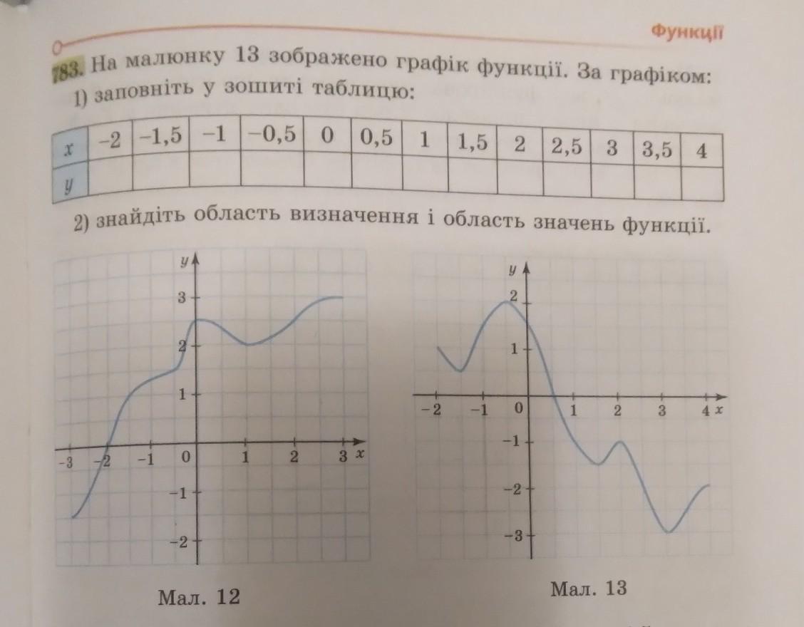 . На 78.3. На малюнку 13 зображено графік функції. За графіком: 1) заповніть у зошиті табличку. - 2) знайдіть область визначення і область значень функції.