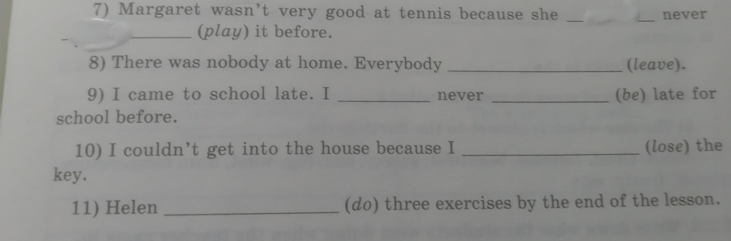 7)Margaret wasn't good at tennis because she is never plays it before 8)There was nobody at home . Everybody leave