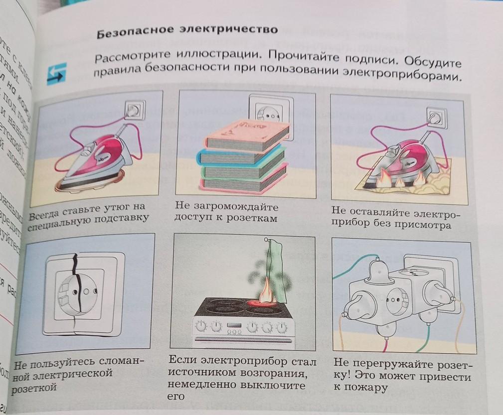 Рассмотрите иллюстрации. Прочитайте подписи. Обсудите правила безопасности при пользовании электроприборами.