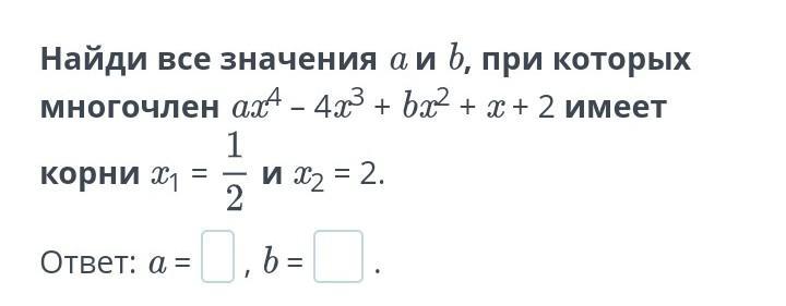 Найди все значения a и b, при которых многочлен ax⁴ – 4x³ + bx² + x + 2 имеет корни x1 =1/2 и x2 = 2.