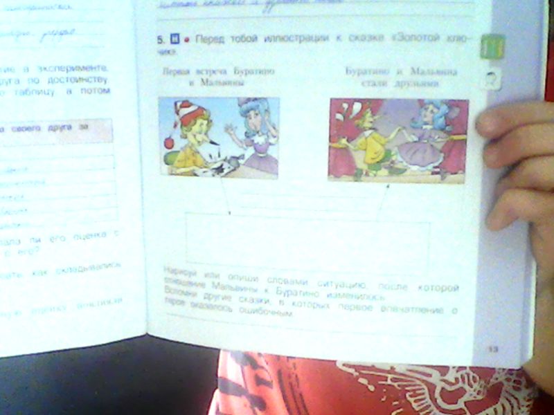 внизу написано:опиши словами ситуацию после которой отношение мальвины к буратино изменились.Вспомни другие сказки в которых первое впечатление о герое оказалось ошибочным