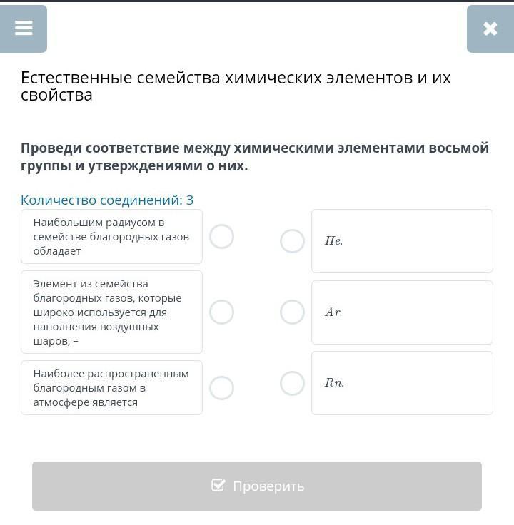 Проведи соответствие между химическими элементами восьмой группы и утверждениями о них. Количество соединений: 3 Наибольшим радиусом в семействе благородных газов обладает He Элемент из семейства благородных газов, которые широко используется для наполнения воздушных шаров, - Ar. Наиболее распространенным благородным газом в атмосфере является Rn.