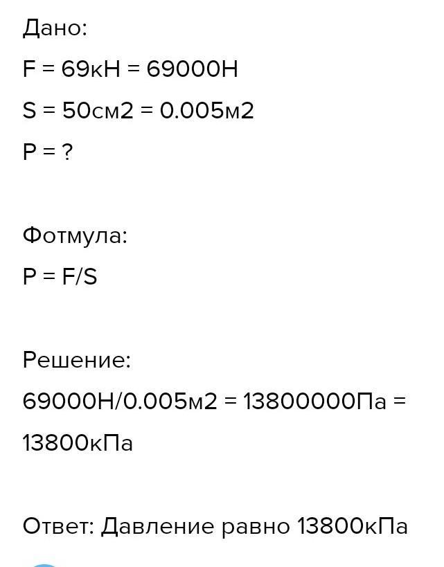 Вес легковой автомашины равен 69кH. Площадь опоры каждого колеса равна 16см.2 . Какое давление оказывает легковая машина на соответствующую поверхность?