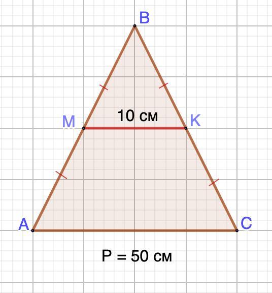 Средняя линия равнобедренного треугольника, парал- лельная основанию, равна 10. Найдите длину боковой стороны этого тре- угольника, если его периметр равен 50.