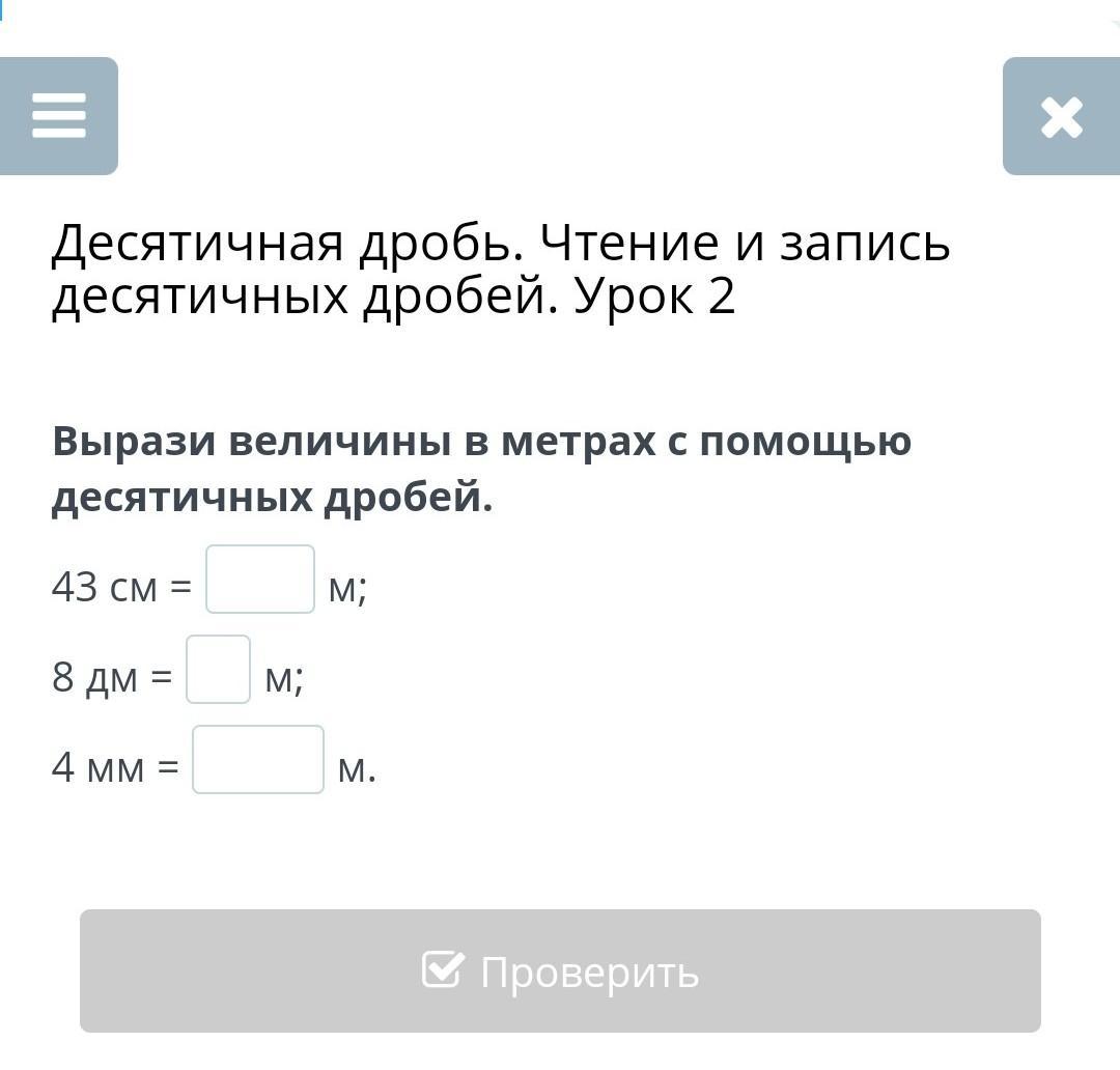 Десятичная дробь. Чтение и запись десятичных дробей. Урок 2 Вырази величины в метрах с помощью десятичных дробей. 43 см = м; 8 дм = м; 4 мм = м.