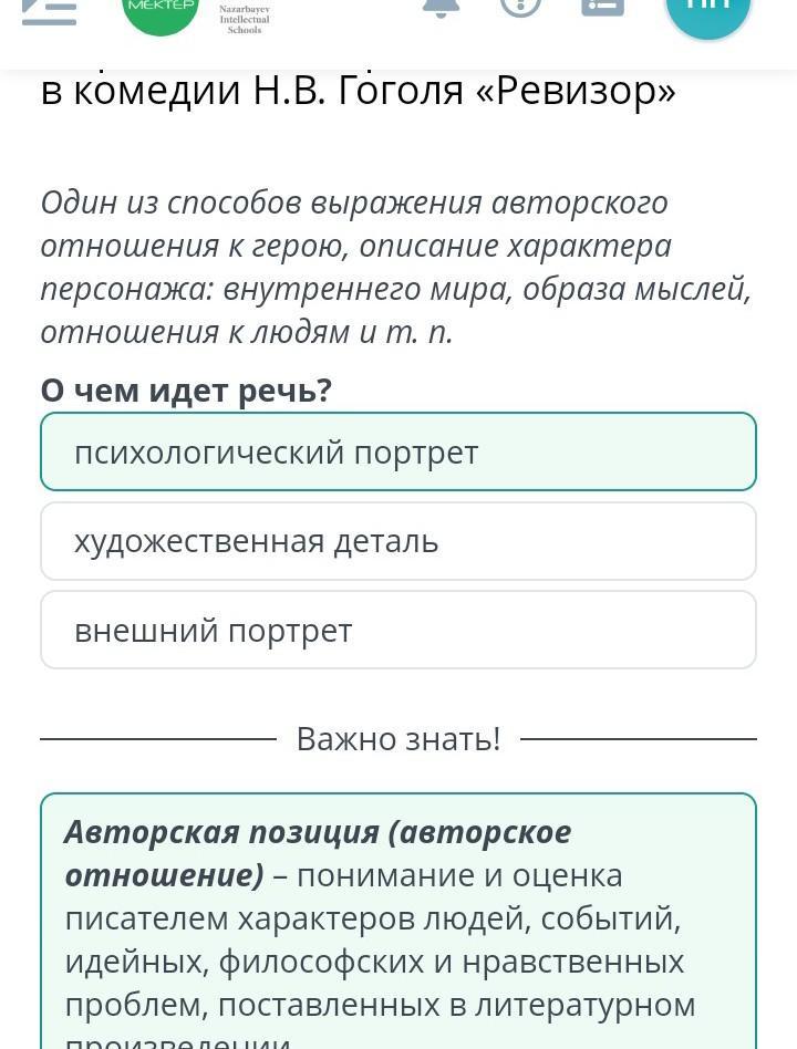 Выражение авторского отношения в комедии Н.В. Гоголя «Ревизор» Один из способов выражения авторского отношения к герою, описание характера персонажа: внутреннего мира, образа мыслей, отношения к людям и т. п. О чем идет речь? внешний портрет психологический портрет художественная деталь