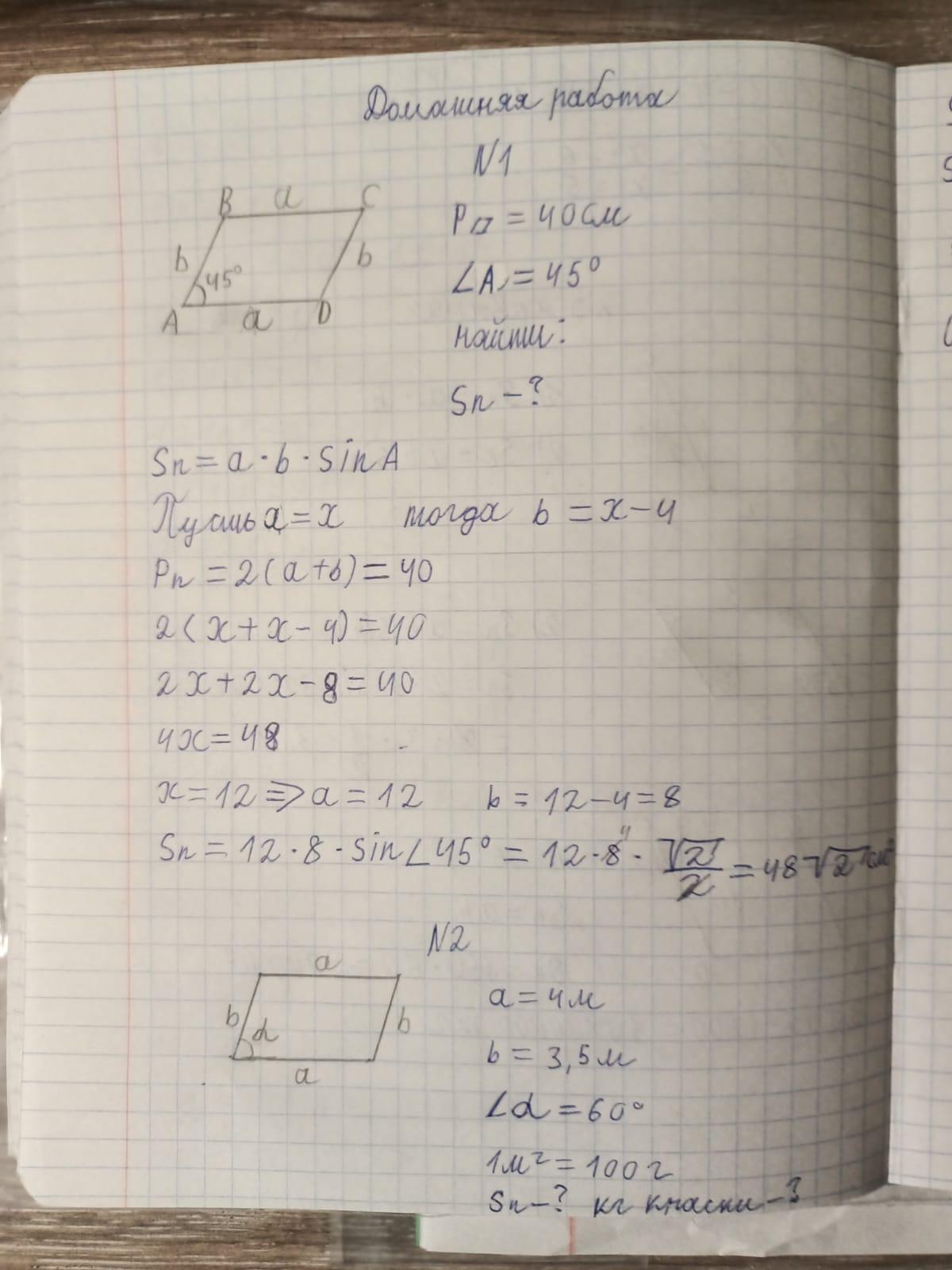 1. Периметр параллелограмма равен 40 см. Острый угол равен 45 градусов а разность двух его сторон – 4 см. Найдите площадь параллелограмма.
