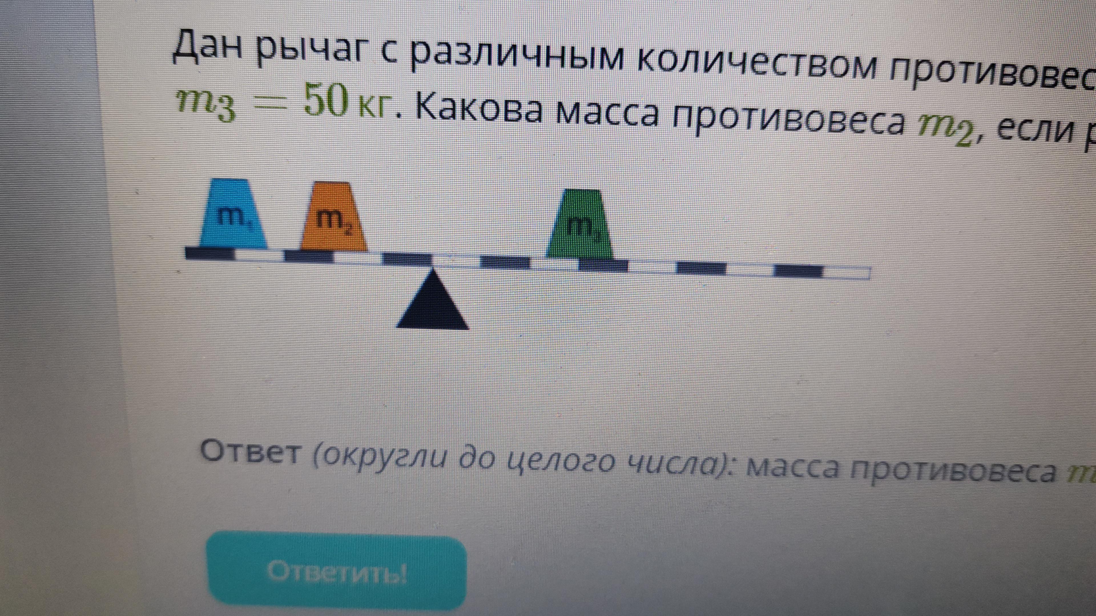 Дан рычаг с различным количеством противовесов на каждой стороне. Массы противовесов м1-12кг и м3-50кг. Какова масса противовеса м2, если рычаг находится в равновесии?