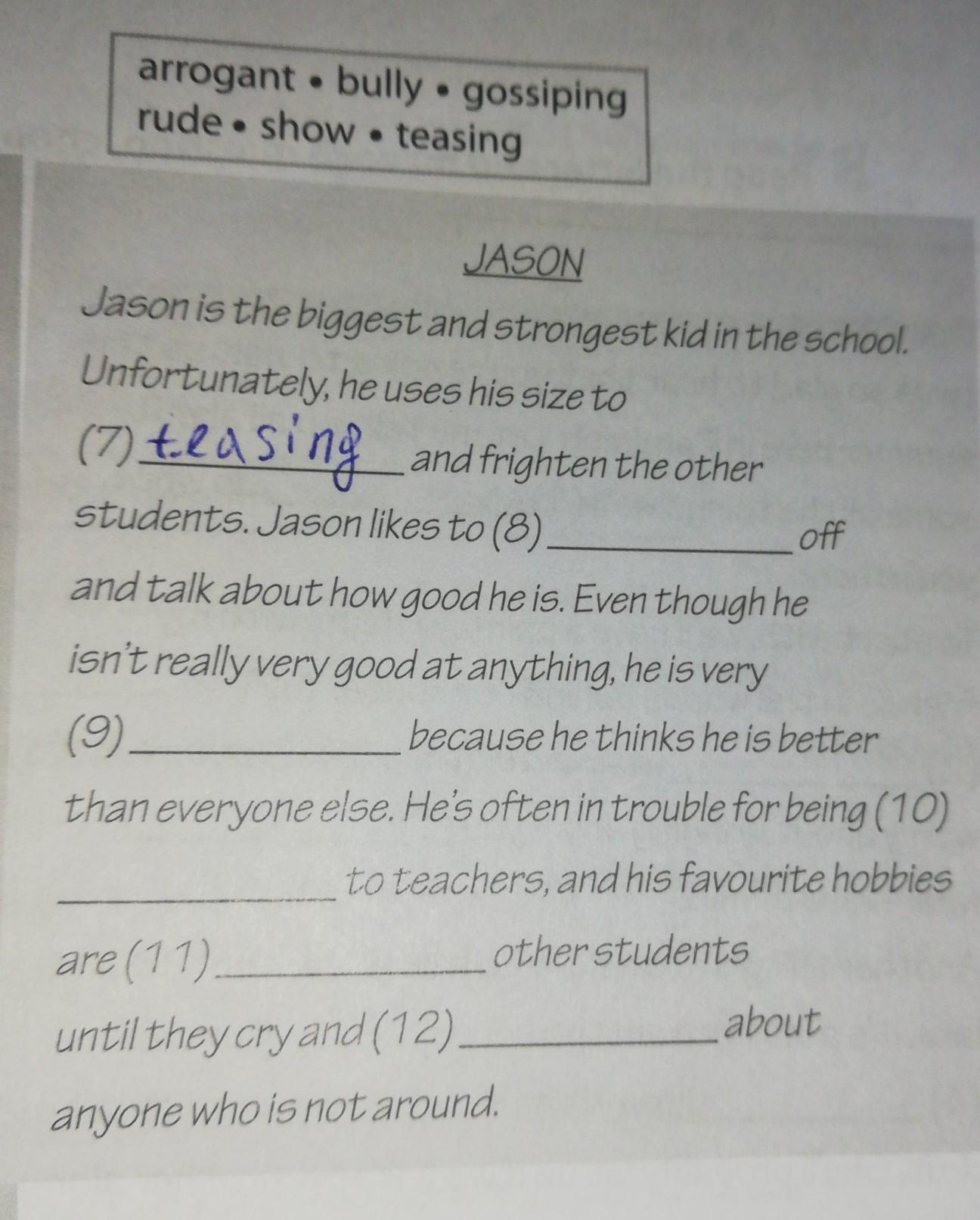 (8)- show, (9) arrogant, (10) rude, (11) bully, (12) gossiping
