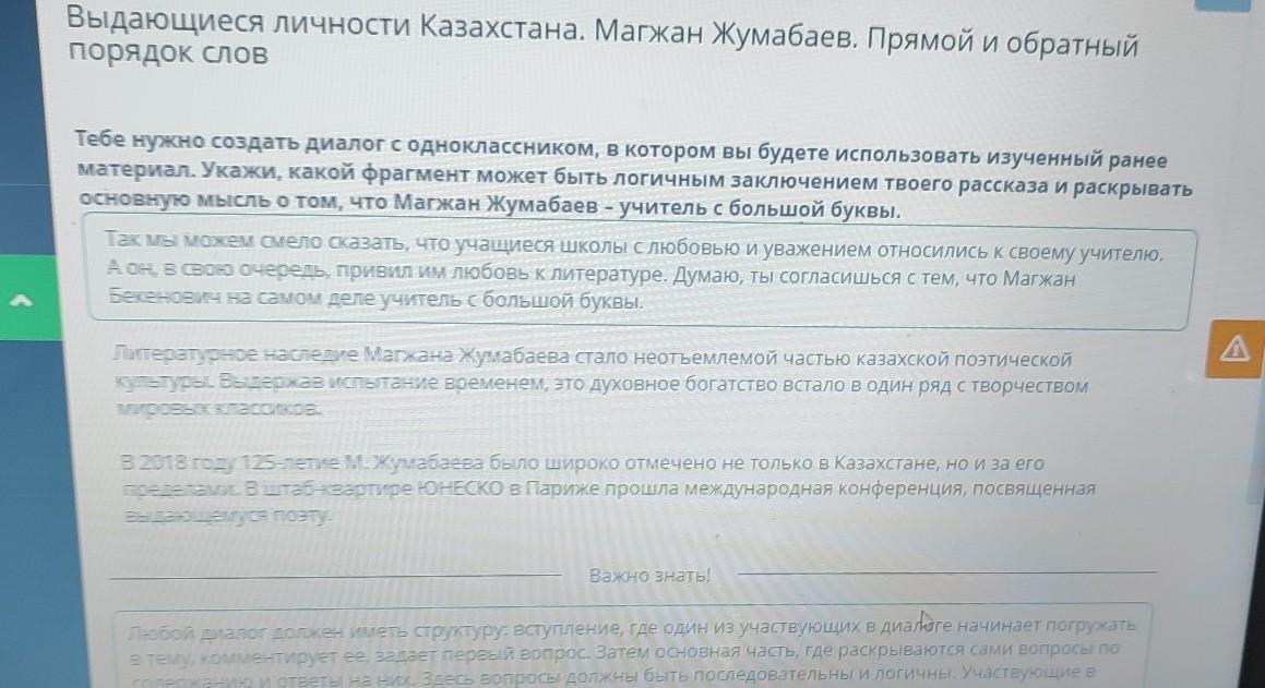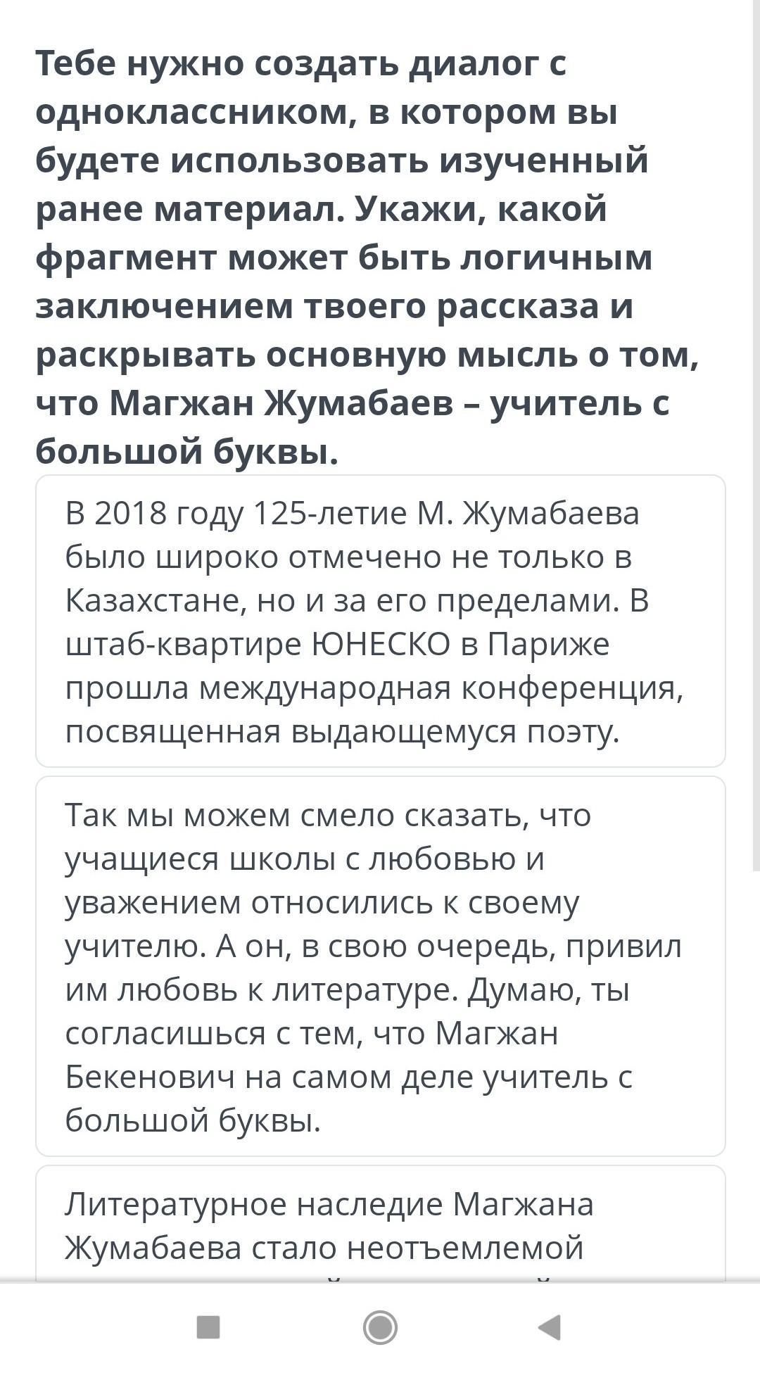 Тебе нужно создать диалог с одноклассником, в котором вы будете использовать изученный ранее материал. Укажи, какой фрагмент может быть логичным заключением твоего рассказа и раскрывать основную мысль о том, что Магжан Жумабаев - учитель с большой буквы. В 2018 году 125-летие М. Жумабаева было широко отмечено не только в Казахстане, но и за его пределами. В штаб-квартире ЮНЕСКО в Париже прошла международная конференция, посвященная выдающемуся поэту. Так мы можем смело сказать, что учащиеся школы с любовью и уважением относились к своему учителю. А он, в свою очередь, привил им любовь к литературе. Думаю, ты согласишься с тем, что Магжан Бекенович на самом деле учитель с большой буквы. Литературное наследие Магжана Жумабаева стало неотъемлемой
