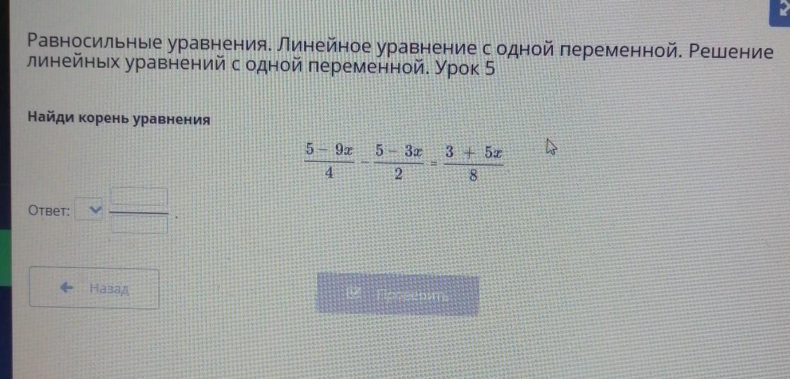 Равносильные уравнения. Линейное уравнение с одной переменной. Решение линейных уравнений с одной переменной. Урок 5 Найди корень уравнения o 3 + 50 5 - 9.2 4 5 – 3х 2 8 Ответ: Назад Проверить