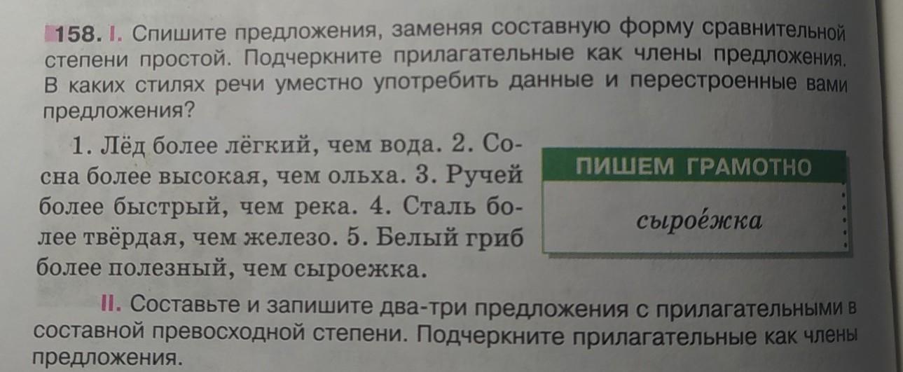 158. І. Спишите предложения, заменяя составную форму сравнительной степени простой. Подчеркните прилагательные как члены предложения, В каких стилях речи уместно употребить данные и перестроенные вами предложения? 1. Лёд более лёгкий, чем вода. 2. Со- сна более высокая, чем ольха. 3. Ручей более быстрый, чем река. 4. Сталь бо- сыроежка лее твёрдая, чем железо. 5. Белый гриб более полезный, чем сыроежка. II. Составьте и запишите два-три предложения с прилагательными в составной превосходной степени. Подчеркните прилагательные как члены предложения.