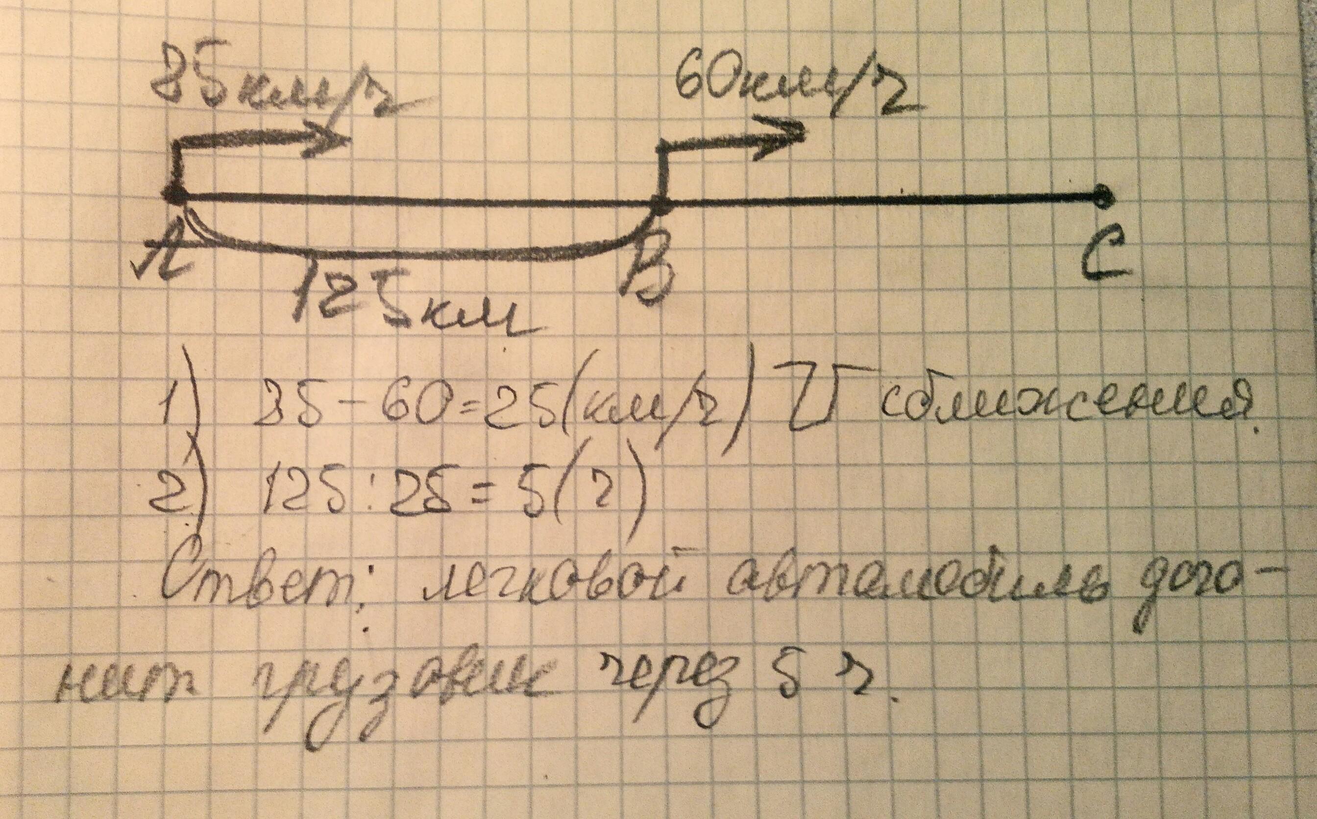 Города А, В и С соединены шоссе, город в расположен меж- со скоростью 85 км/ч, и одновременно с ним из города В в го- ду городами А и С. Из города А в Город С выехал автомобиль род С выехал грузовик со скоростью 60 км/ч. Через сколько часов автомобиль догонит грузовик, если расстояние меж- ду городами А и В равно 125 км?