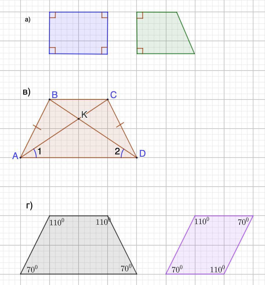 а) Если в четырёхугольнике есть два прямых угла, то этот четырёхугольник — либо прямоугольник, либо трапеция.