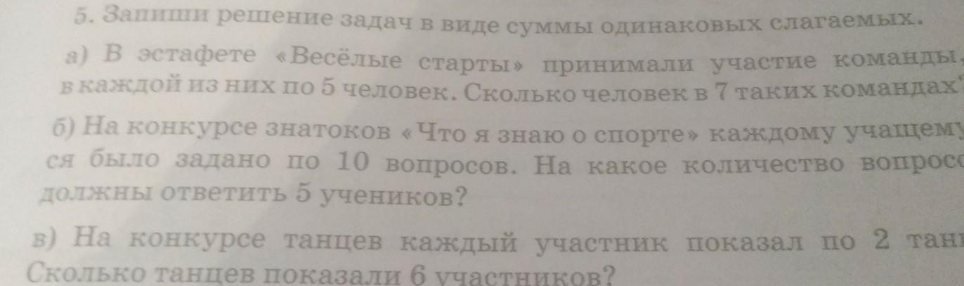 Объяснение :а) 5+5+5+5+5+5+5=35(взяли 5 человек 7 раз, так как в каждой команде по 5 человек, а команд таких 7);б) 10+10+10+10+10=50(взяли 10 вопросов 5 раз, так как каждому учащемуся было задано по 10 вопросов, а опросили 5 учеников. в) 2+2+2+2+2+2=12(взяли 2 танца 6 раз.Сказано, что каждый участник показал 2 танца, а всего участников 6)
