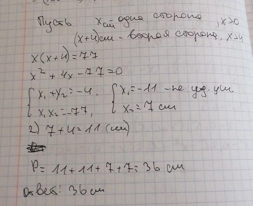 1.Площадь прямоугольника, одна из сторон которого на 4 см больше другой, равна 77. Найдите сумму сторон прямоугольника. ПОЖАЛУЙСТА ПОМОГИТЕ СОР