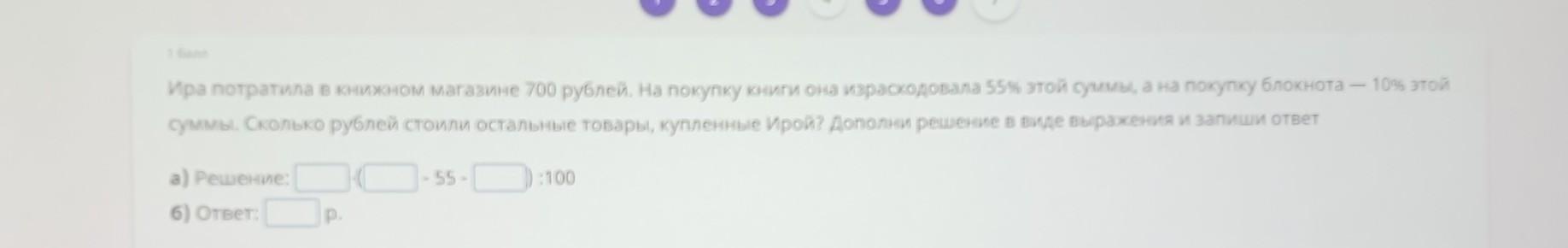 700-(55÷100×700+10÷100×700)= 700-(385+70)=700-455=245 рублей стоили другие товары,купленные товары