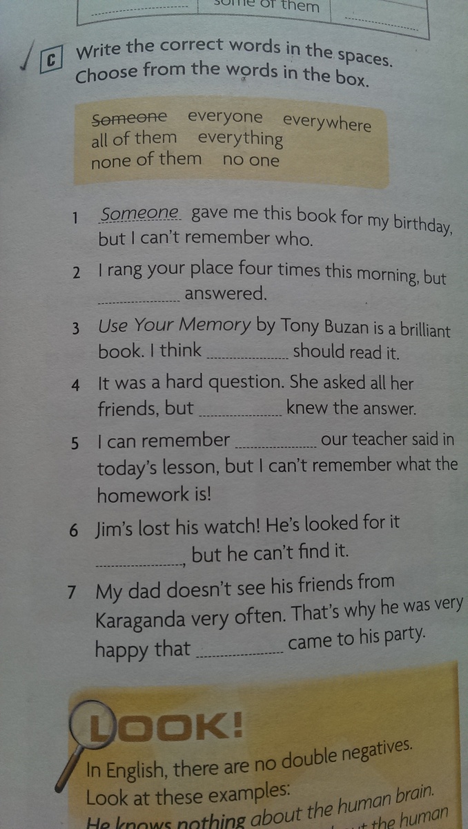 1. Someone gave me this book for my bithday, but i can't remember who. (Кто-то подарил мне эту книжку на День Рождения, но я не помню кто)