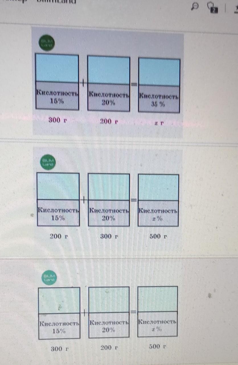 Решение текстовых задач с помощью уравнений. Урок 2 Выбери верный рисунок согласно условию задачи. К 300 г 15%-го раствора вещества добавили 200 г 20%-го раствора. Определи, какова концентрация полученной смеси.