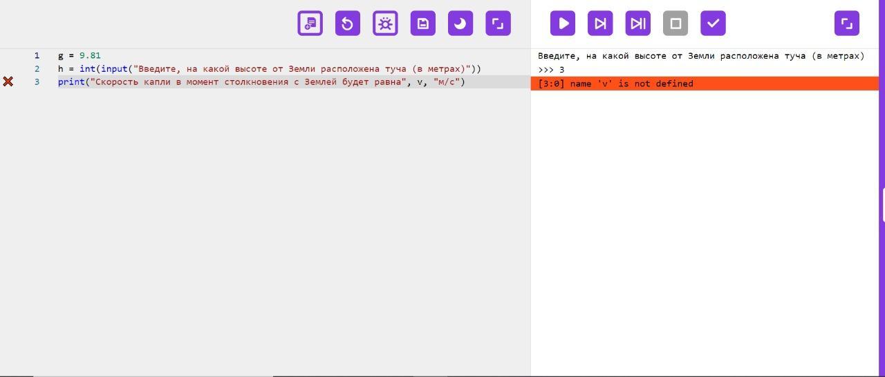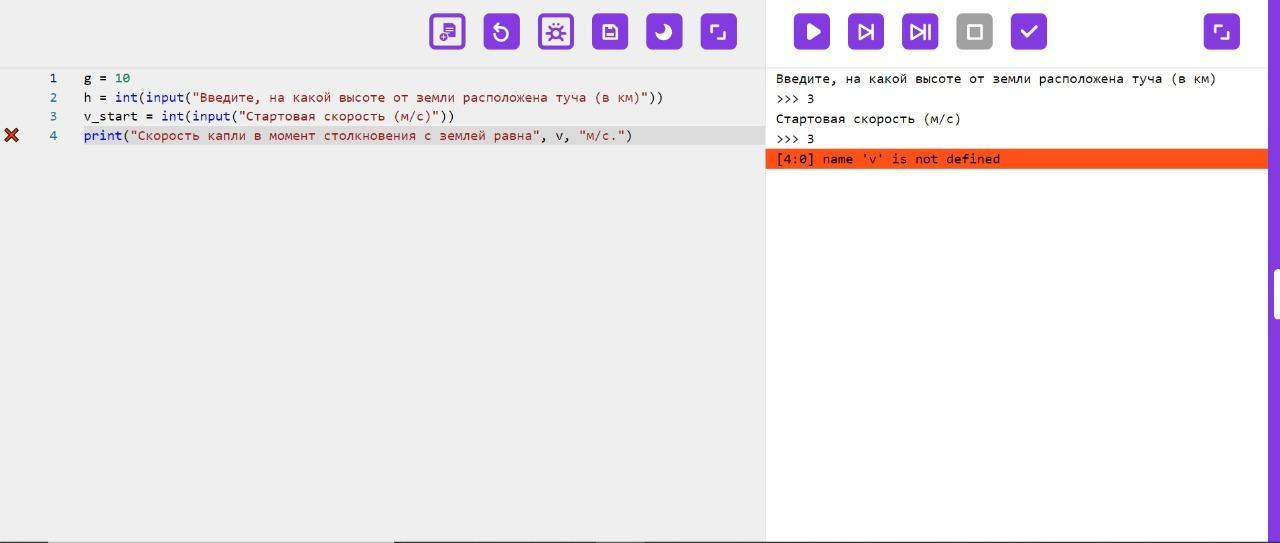 вам нужно либо в отдельной строке приравнивать v к формуле с известными переменными, либо в самом принте указывать не v, а формулу