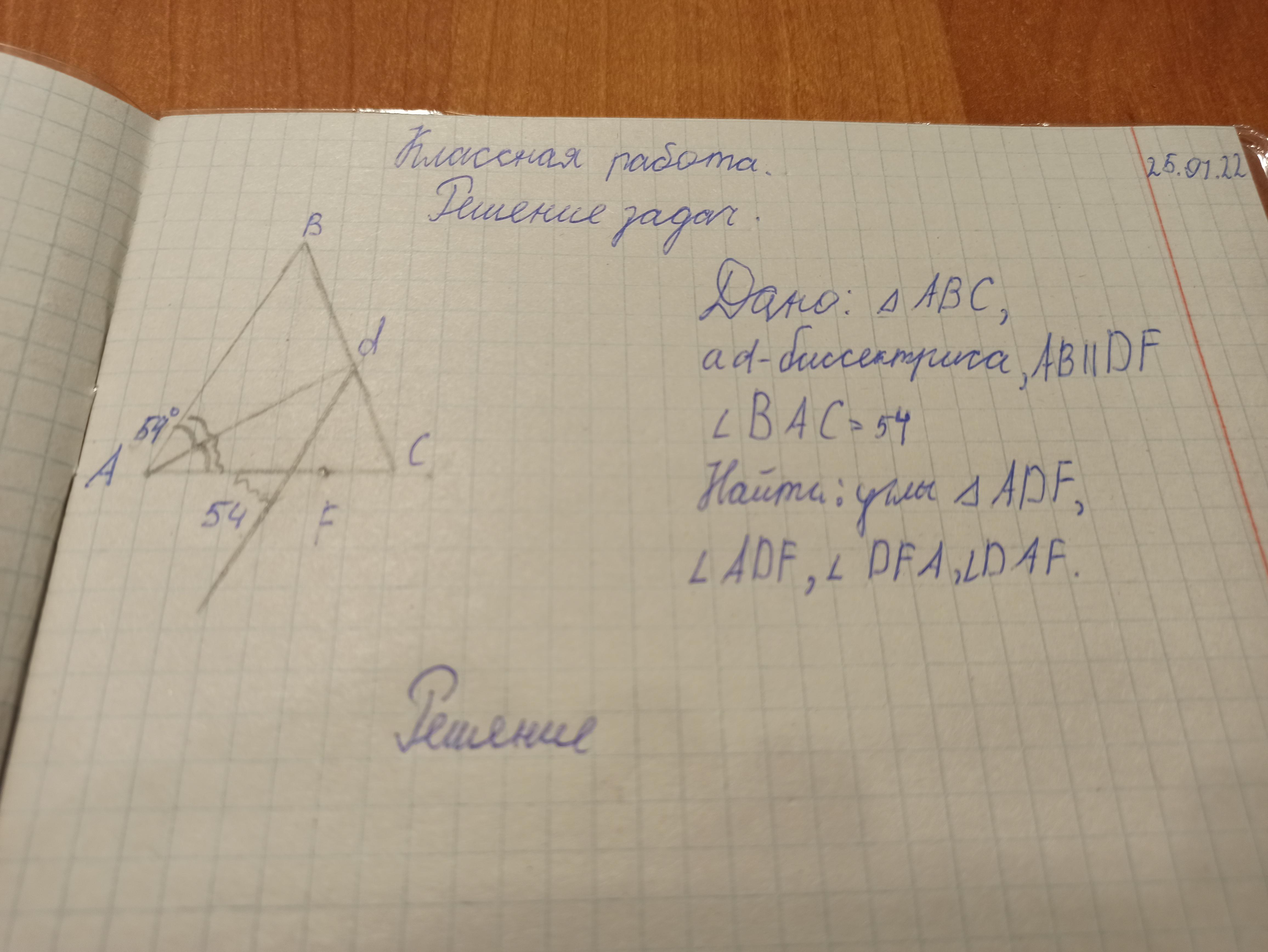 Здравствуйте, срочно, геометрия 7 класс дано: треугольник АВС, аd- биссектриса AВ параллельно DF, угол ВАС=54°