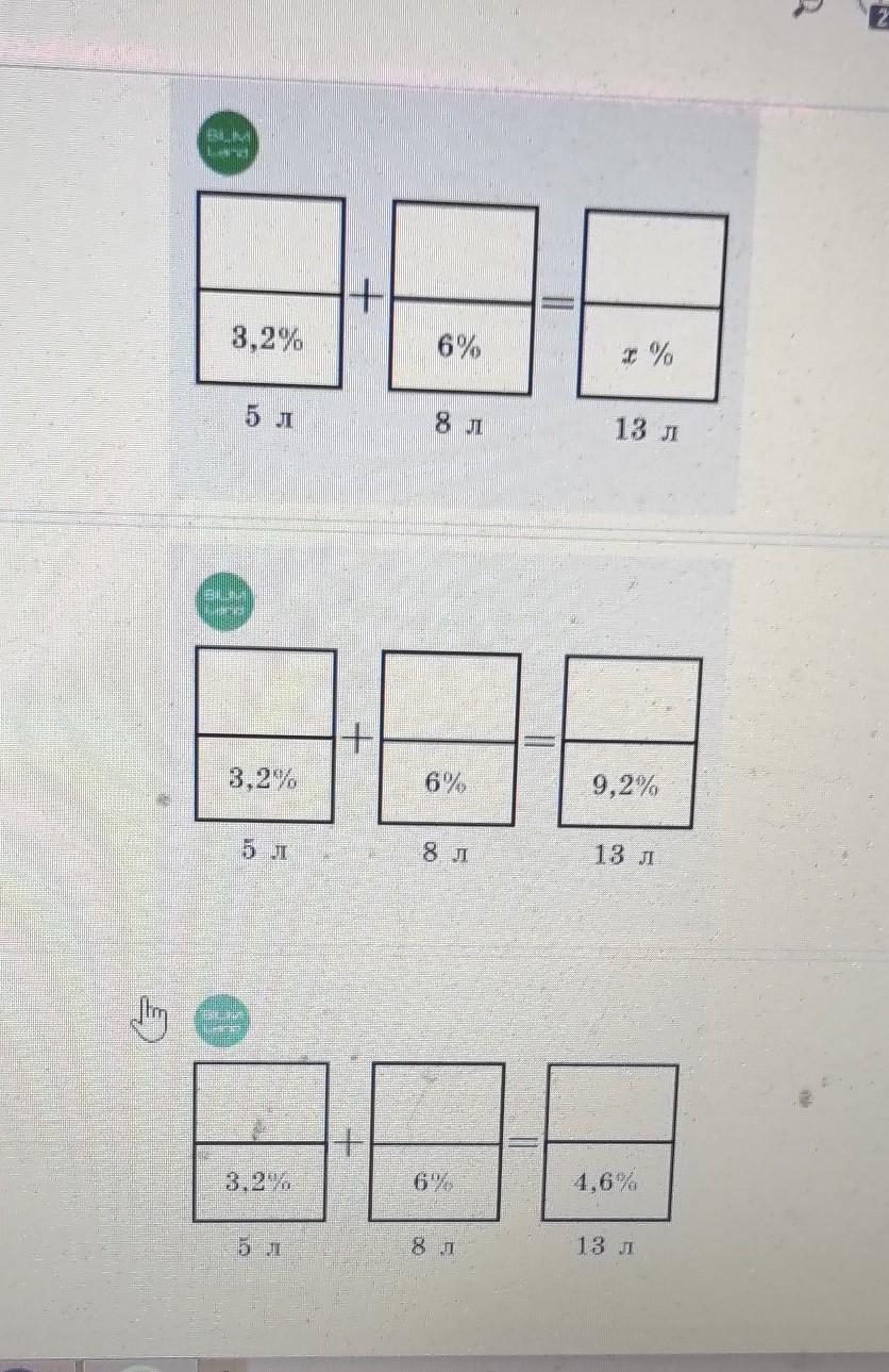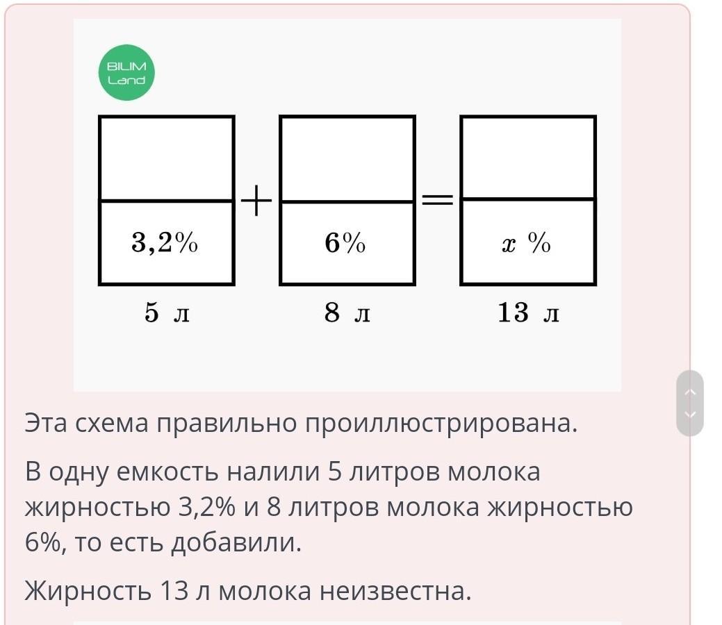 Решение текстовых задач с помощью уравнений. Урок 2 Выбери верный рисунок согласно условию задачи. В одну емкость налили 5 литров молока жирностью 3,2% и 8 литров молока жирностью 6%. Найди жирность полученной молочной смеси.