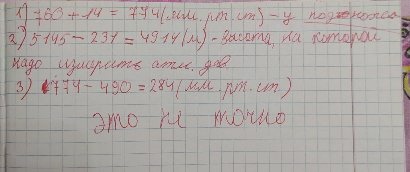 альпинисты поднимаются на гору высотой 5145м, стоящей на острове в океане. каким будет атмосферное давление на склоне горы в точке, расположенной ниже вершины на 231 м, если известно, что у подножия горы на берегу океана оно было выше нормального на 14 мм рт. ст.? Записать подробно ход решения задачи.