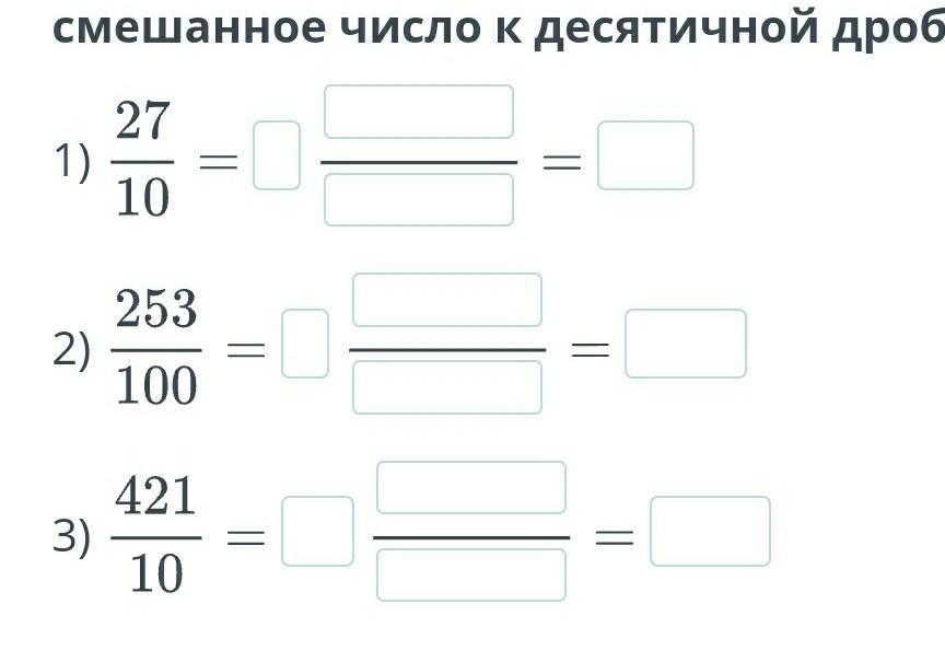 Запиши неправильную дробь в виде смешанного числа. Приведи полученное смешанное число к десятичной дроби.