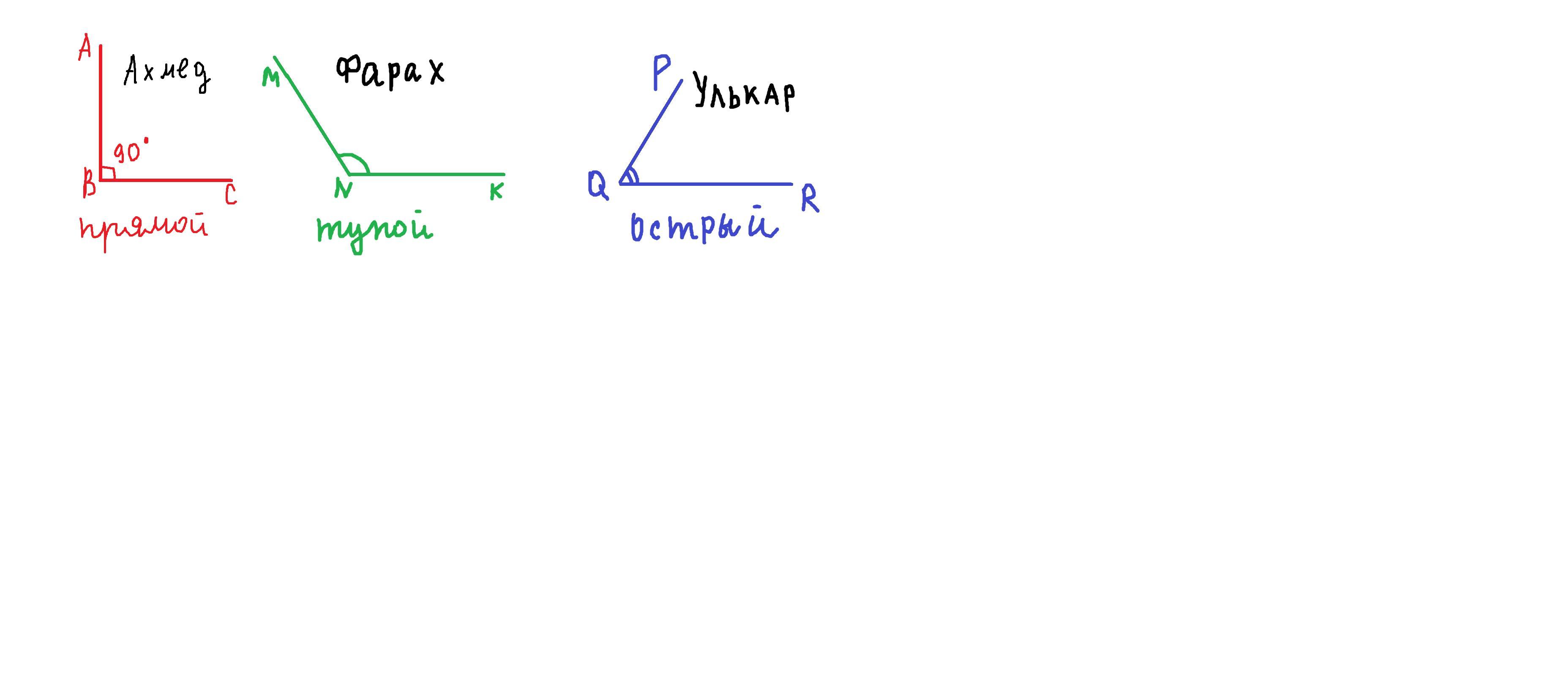 ахмед начертил прямой угол. Угол, который начертила Фарах, больше, а угол, который начертила Улькяр, меньше угла, изображенного Ахмедом. Какой вид угла нарисовал каждый из детей? Изобразите и вы данные углы,