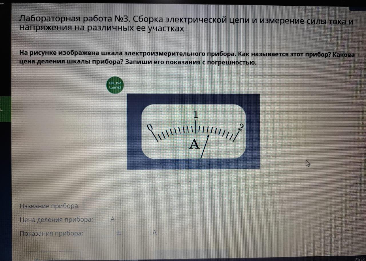 На рисунке изображена шкала электроизмерительного прибора. Как называется этот прибор? Какова цена деления шкалы прибора? Запиши его показания с погрешностью.